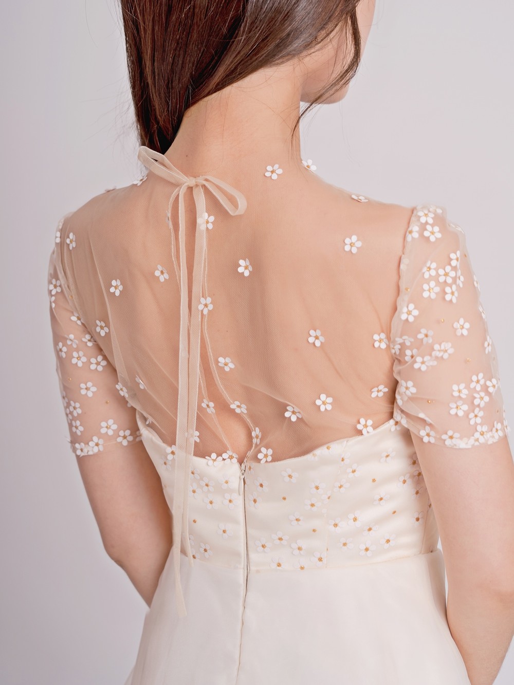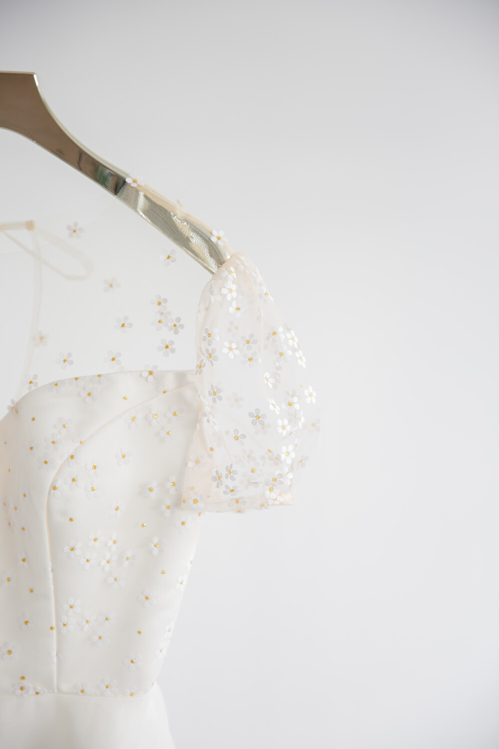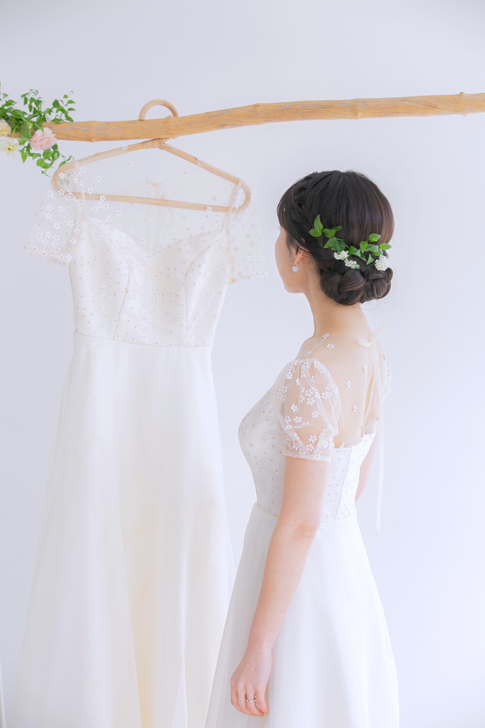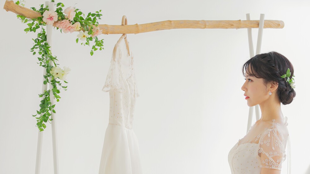 모델 착용 드레스는 화이트 안감을 사용하였습니다. 뒤쪽에 걸려있는 데이지 드레스와 미세한 색감 차이를 확인해주세요 :)