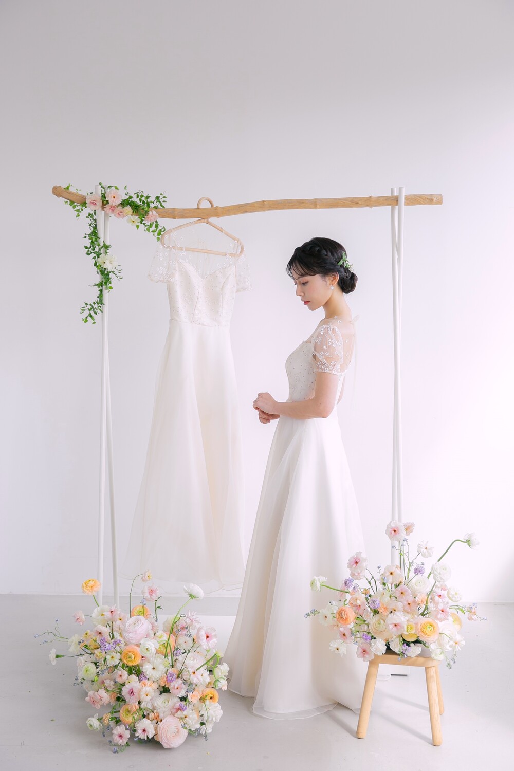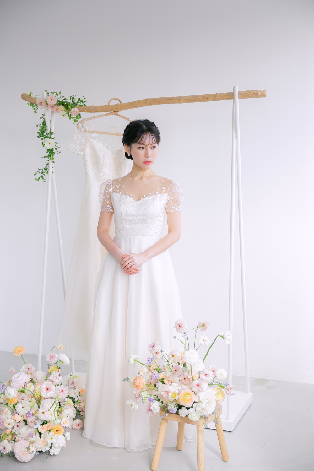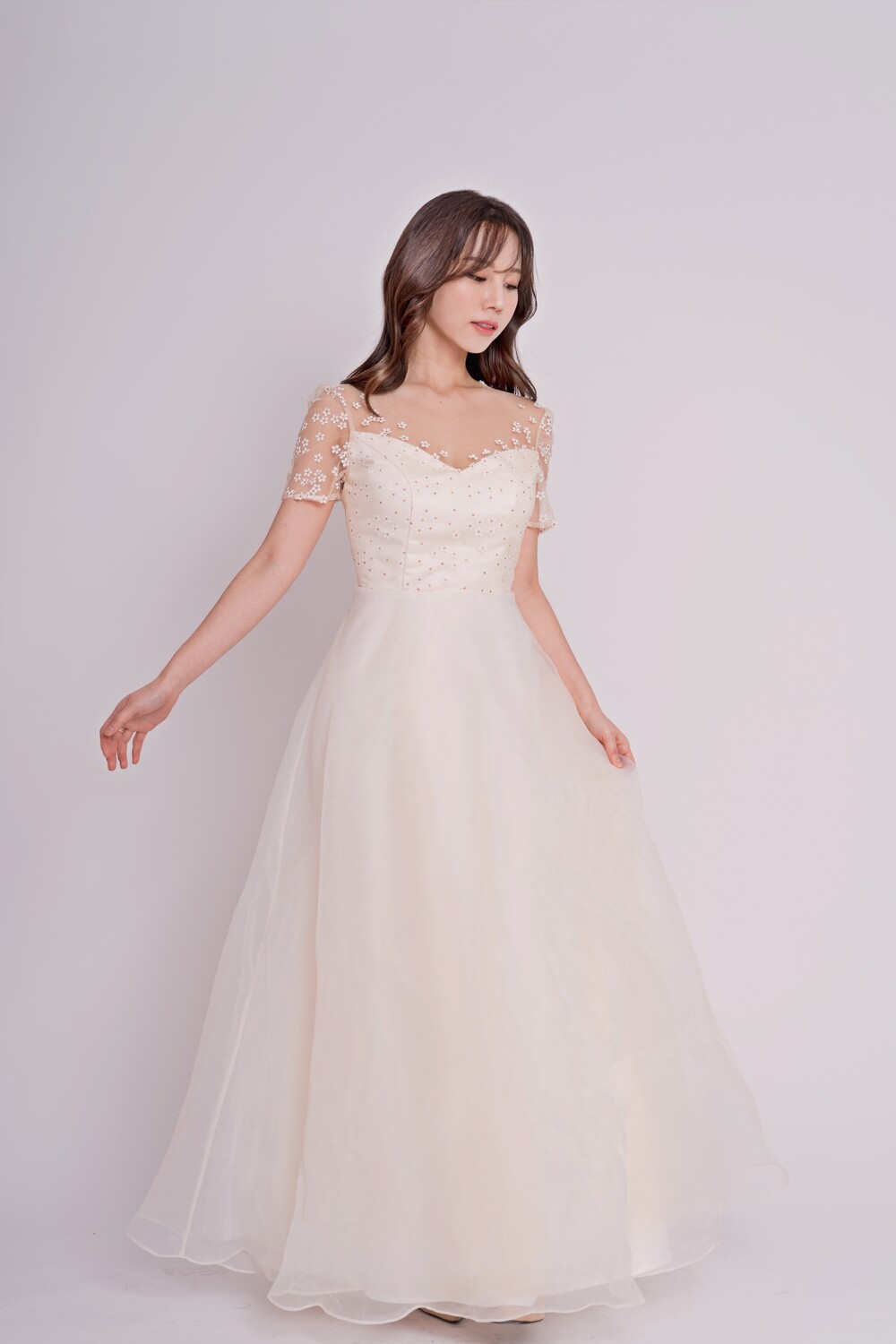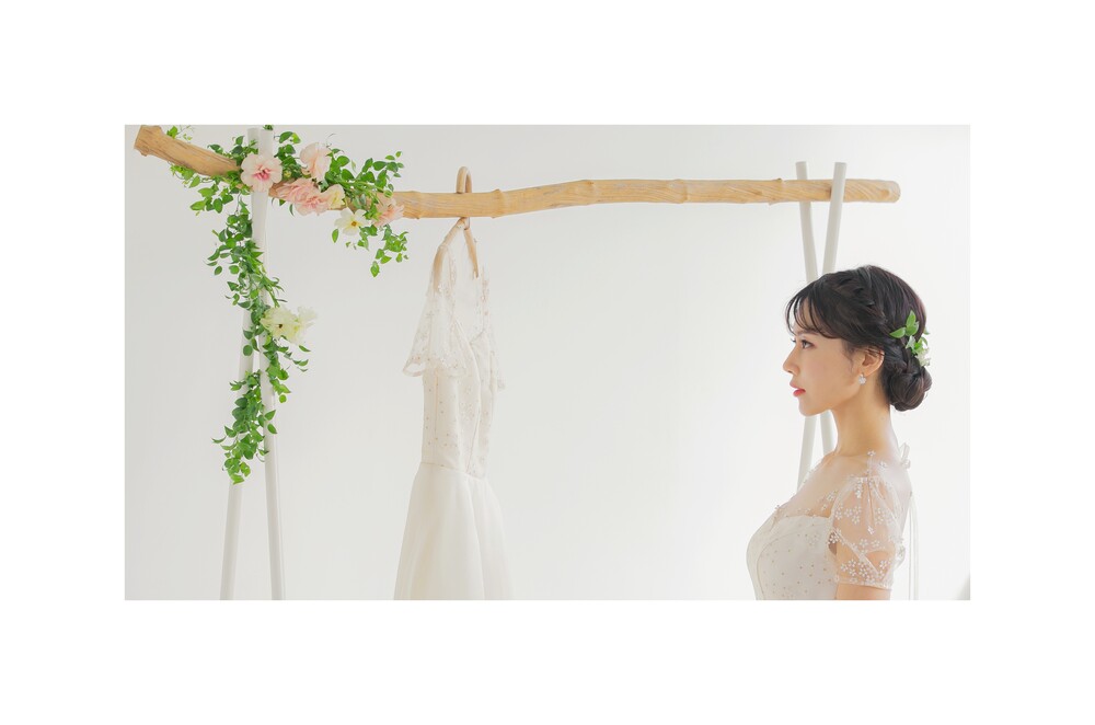 오른쪽 모델 착용 드레스는 화이트 원단의 안감을 사용하여 미세한 색감차이를 느껴볼 수 있답니다 :)