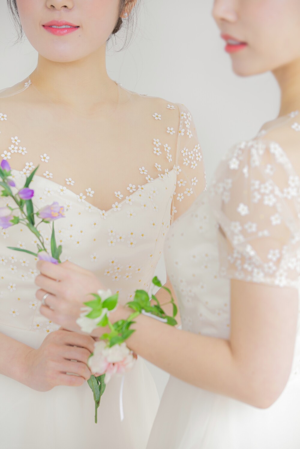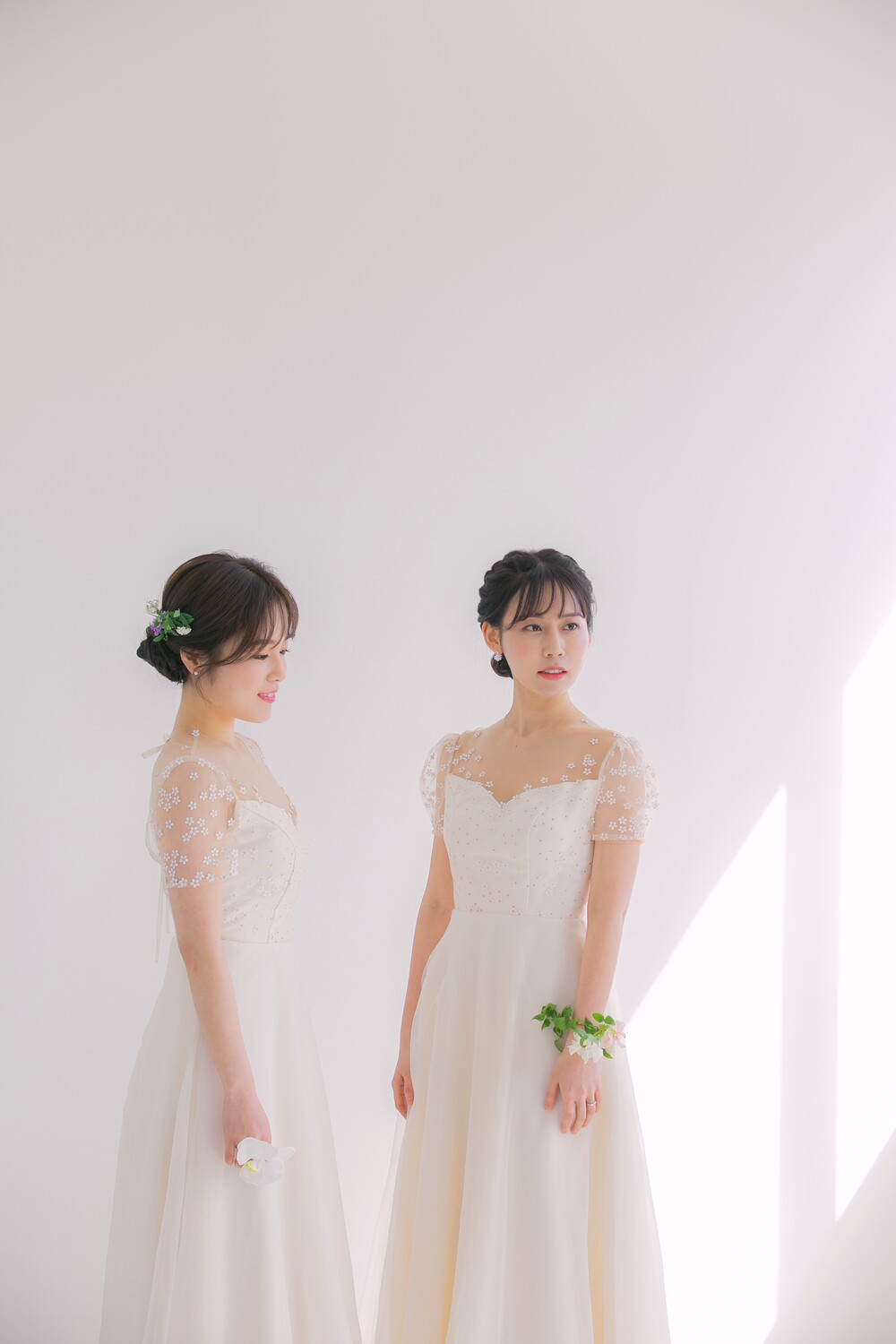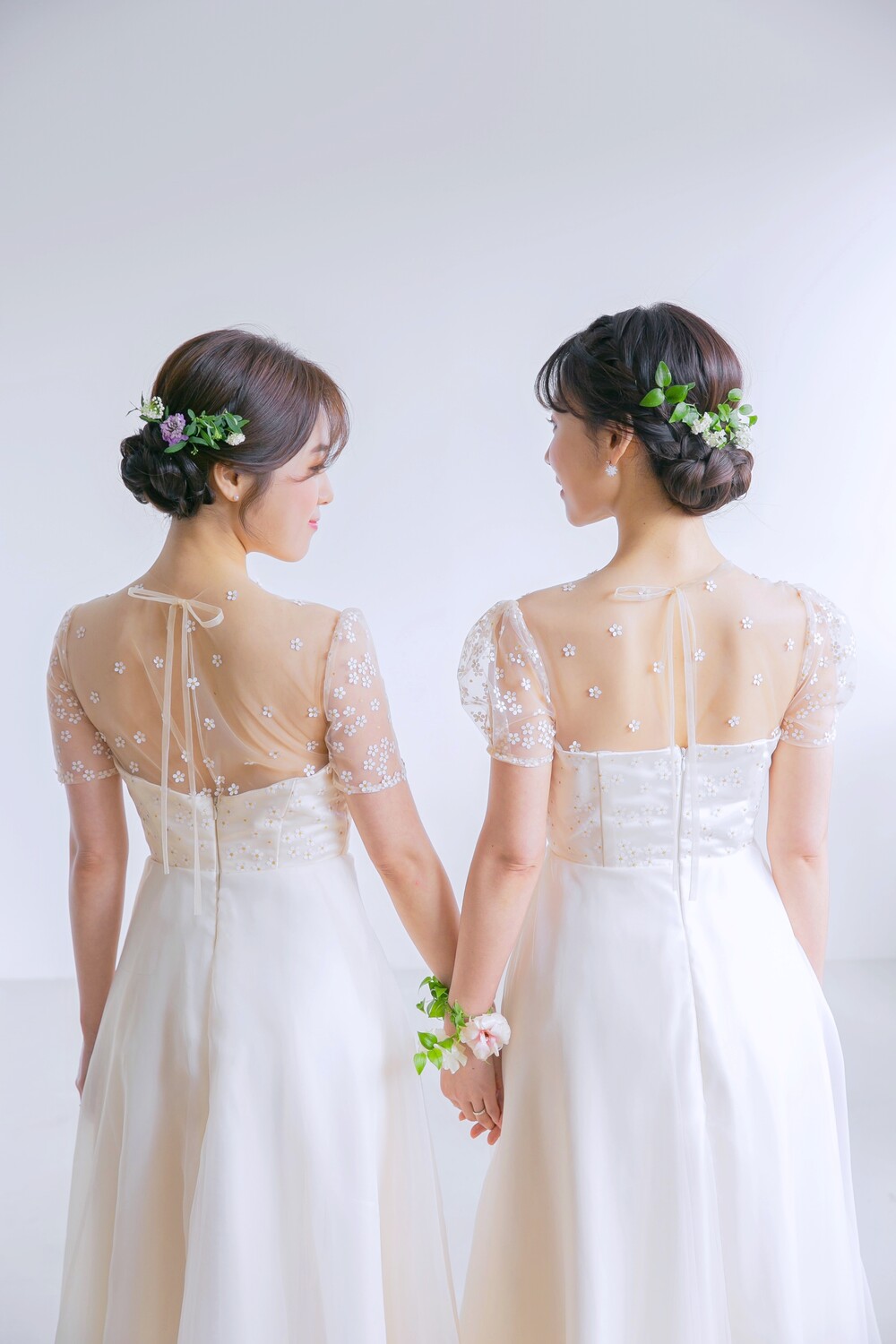 왼쪽 모델이 입은 데이지 드레스는 조금 더 살구빛의 원단을 사용하였고,