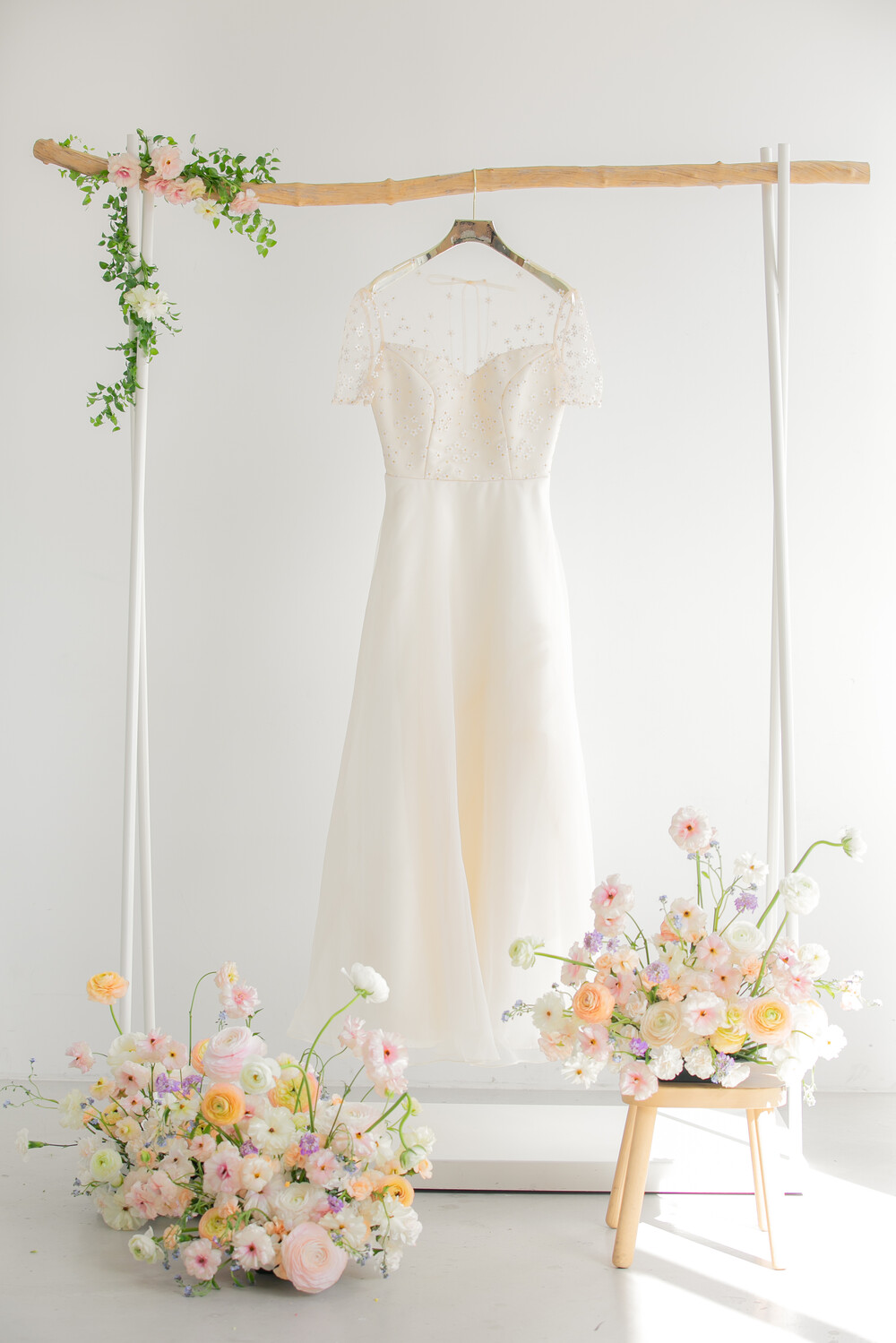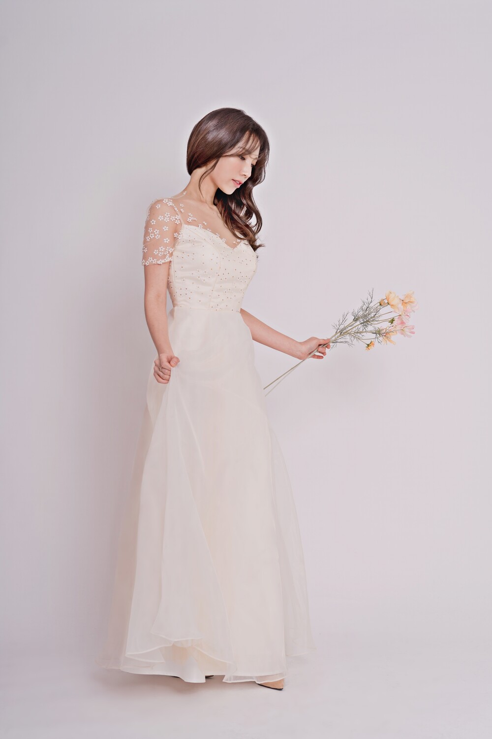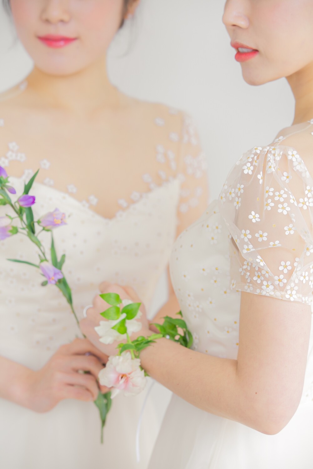 왼쪽 모델이 입은 데이지 드레스는 조금 더 살구빛의 원단을 사용하였고,