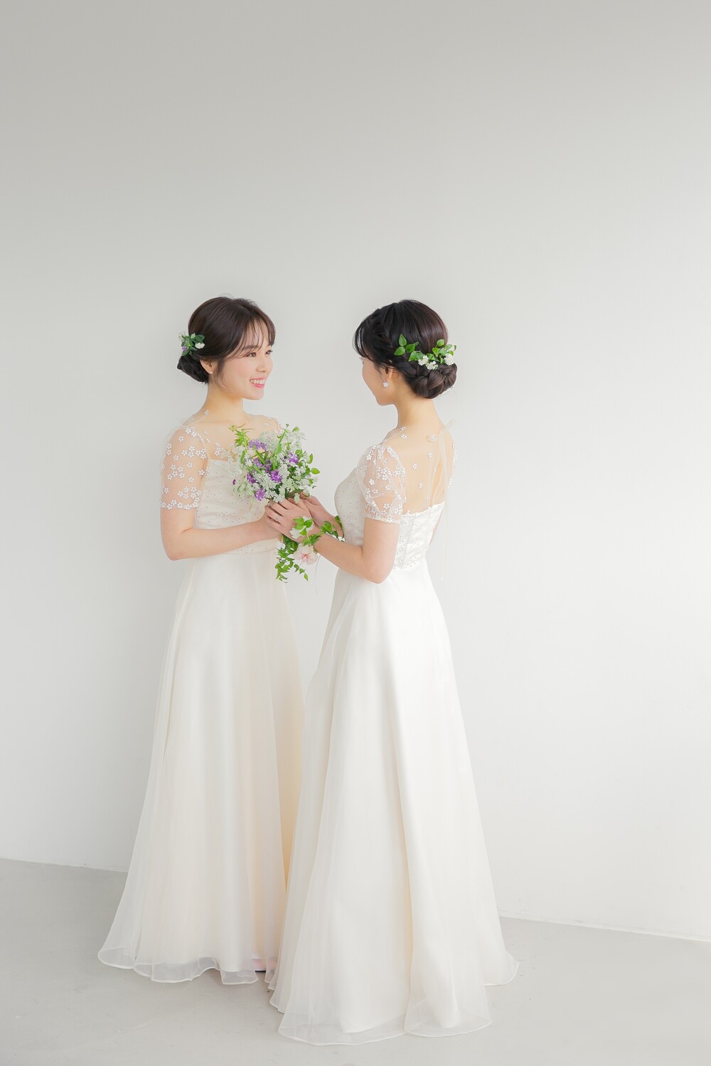 오른쪽 모델의 드레스에는 조금 더 귀여운 퍼프소매를 사용하였답니다.