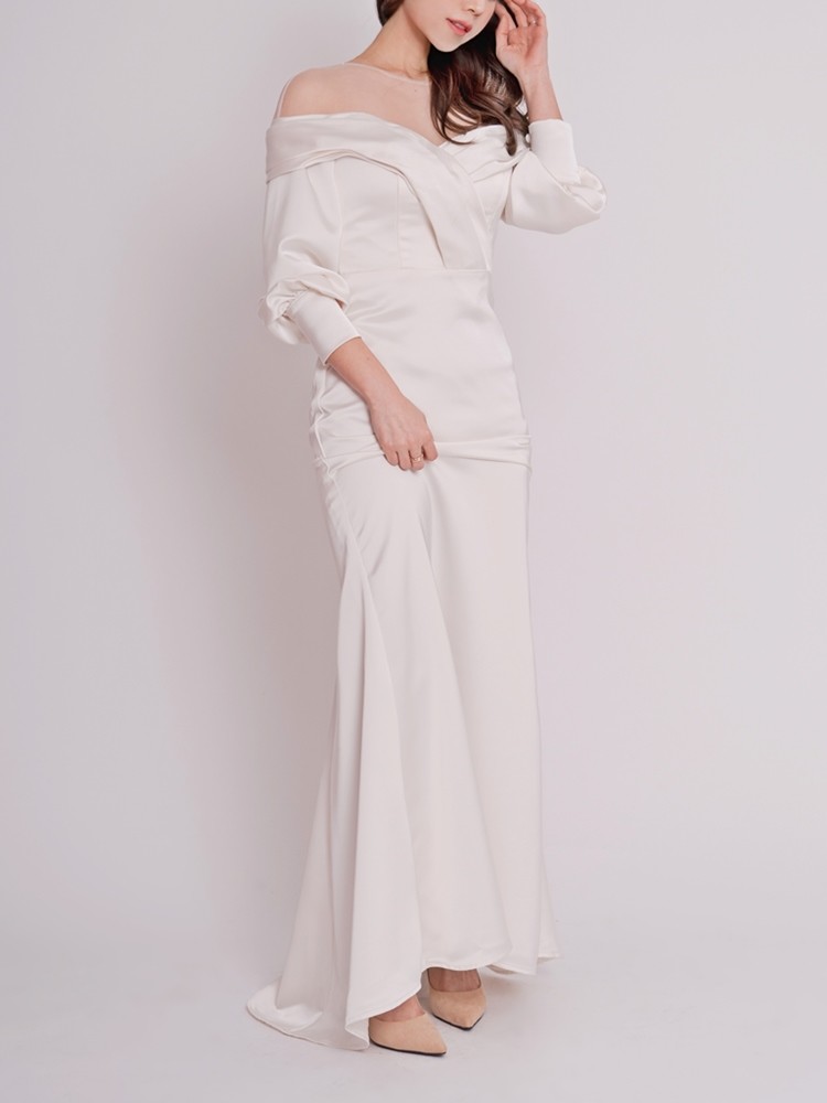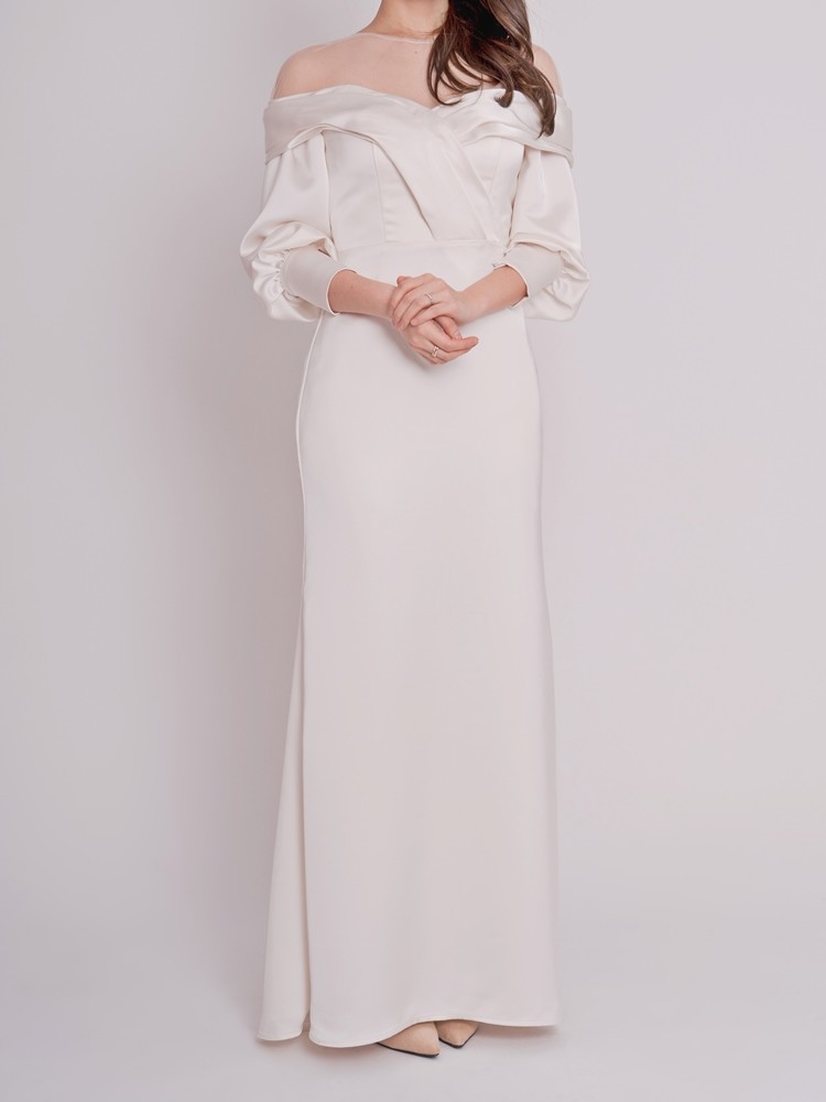 은은한 아이보리가 감도는 부드러운 도비실크에 오프숄더셔츠를 입은듯한 벨라 드레스.