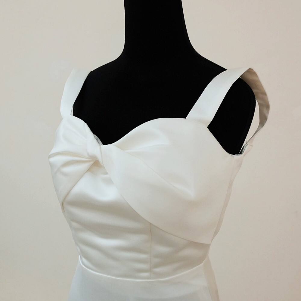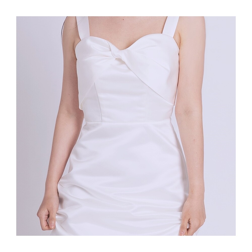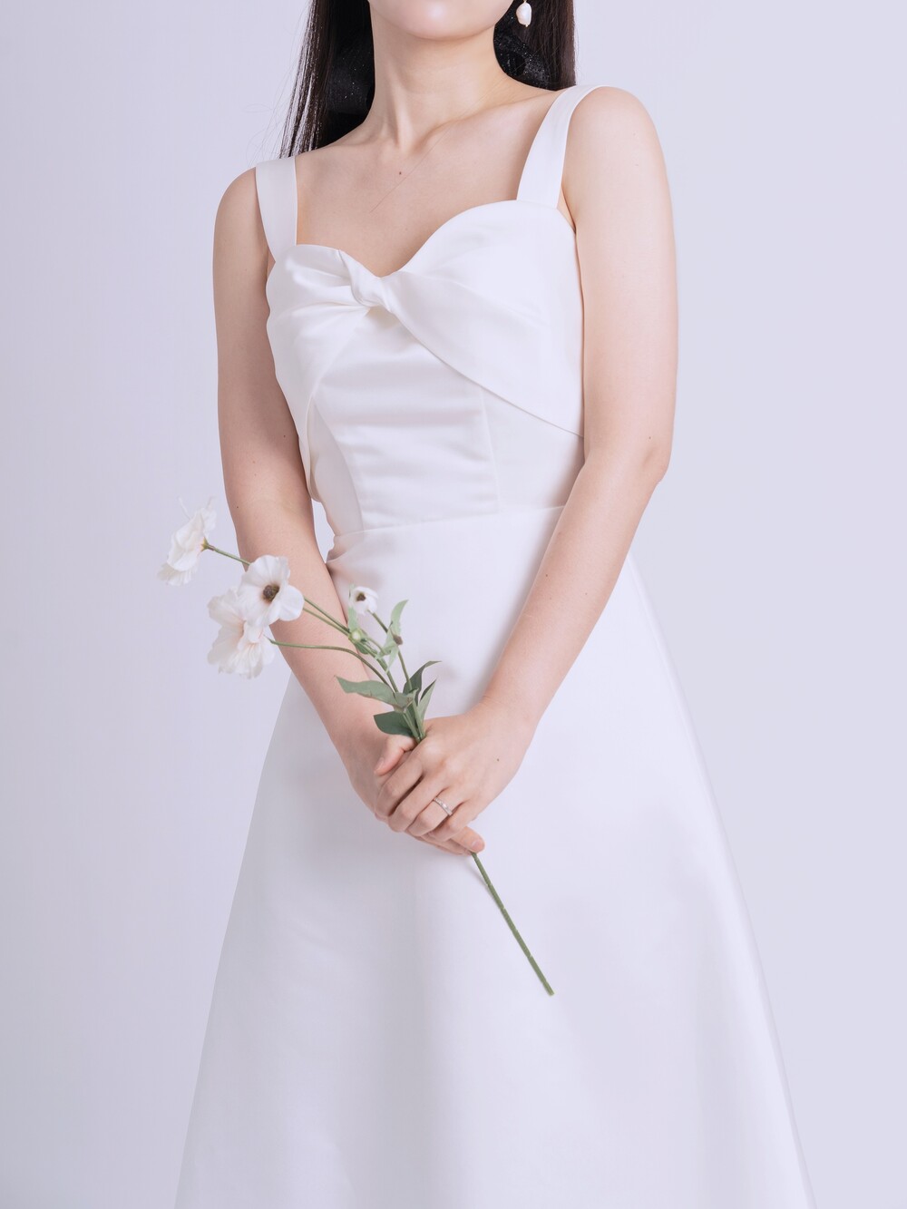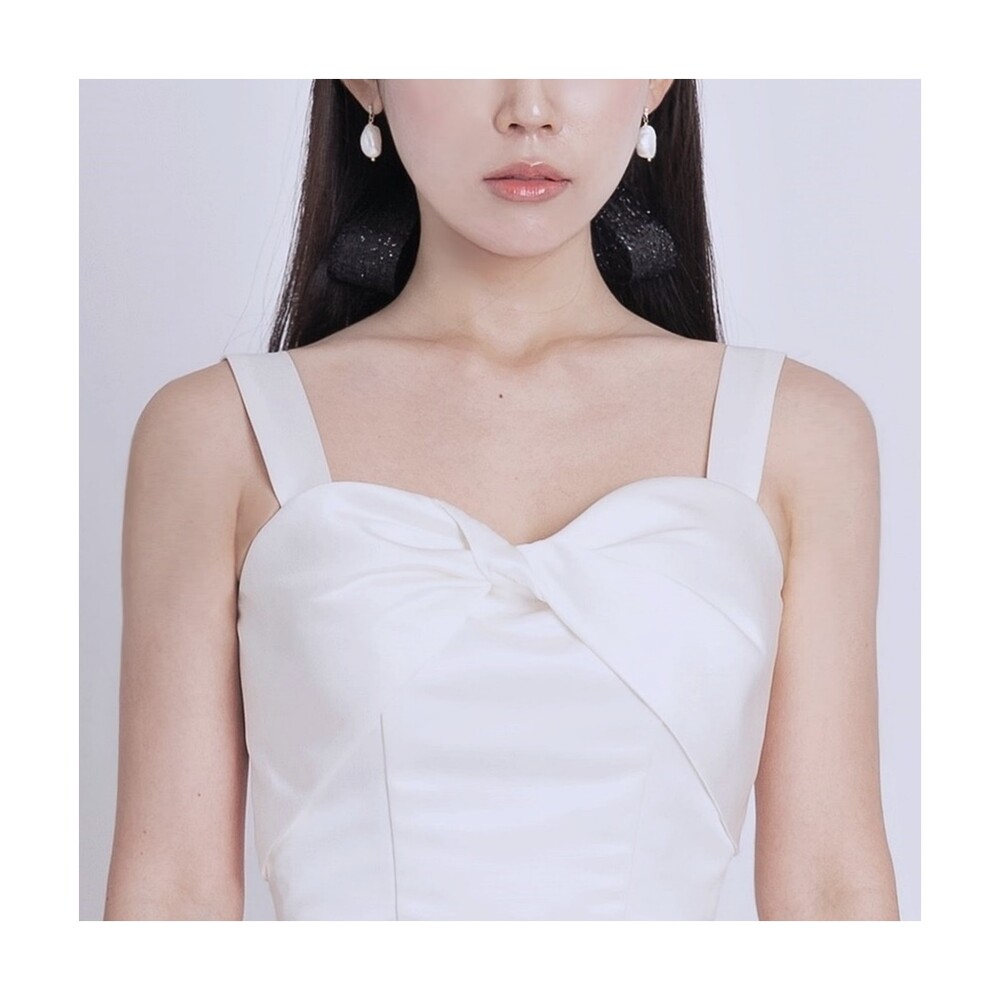 과하지 않게 퍼지는 A라인과 가슴부분의 리본 드레이핑으로 사랑스러움을 더했답니다.
