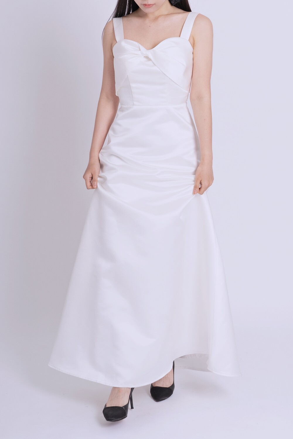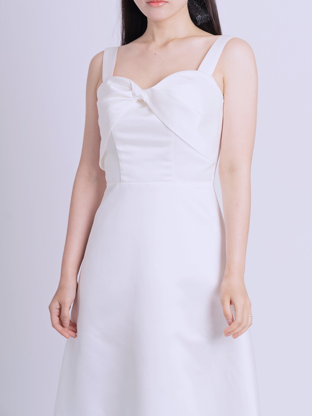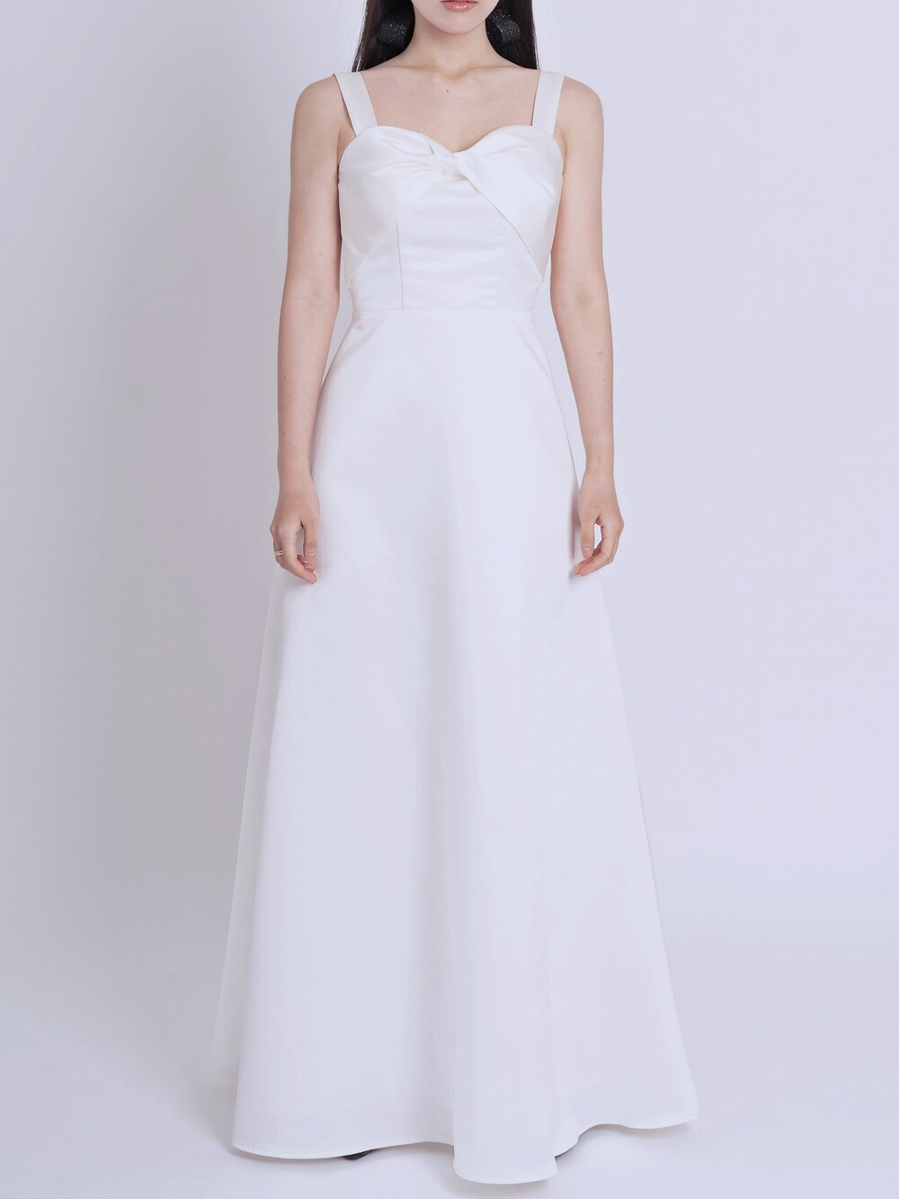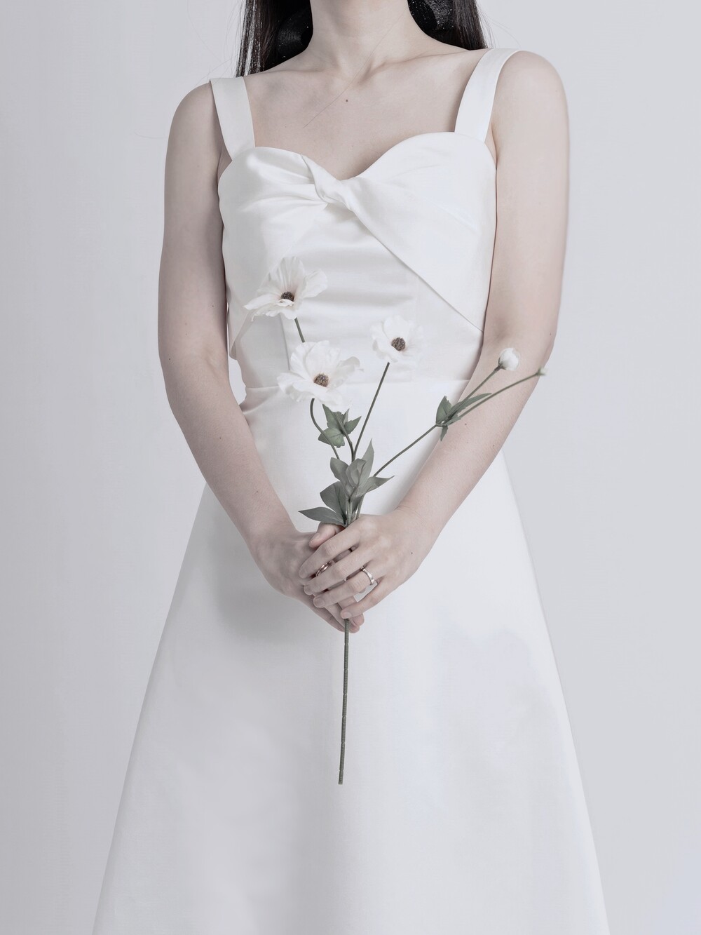 과하지 않게 퍼지는 A라인과 가슴부분의 리본 드레이핑으로 사랑스러움을 더했답니다.