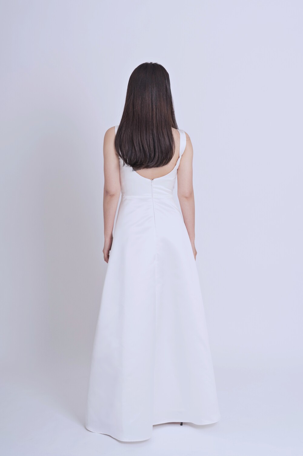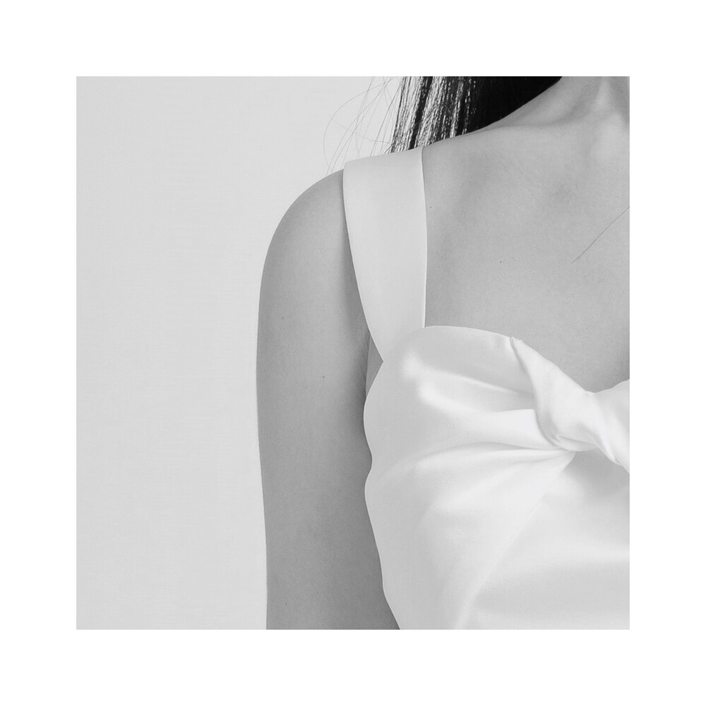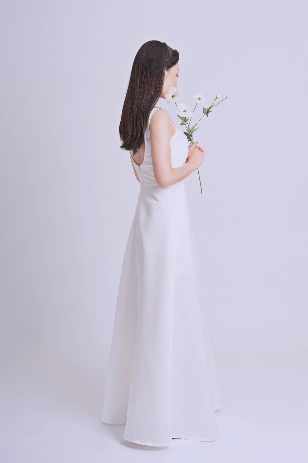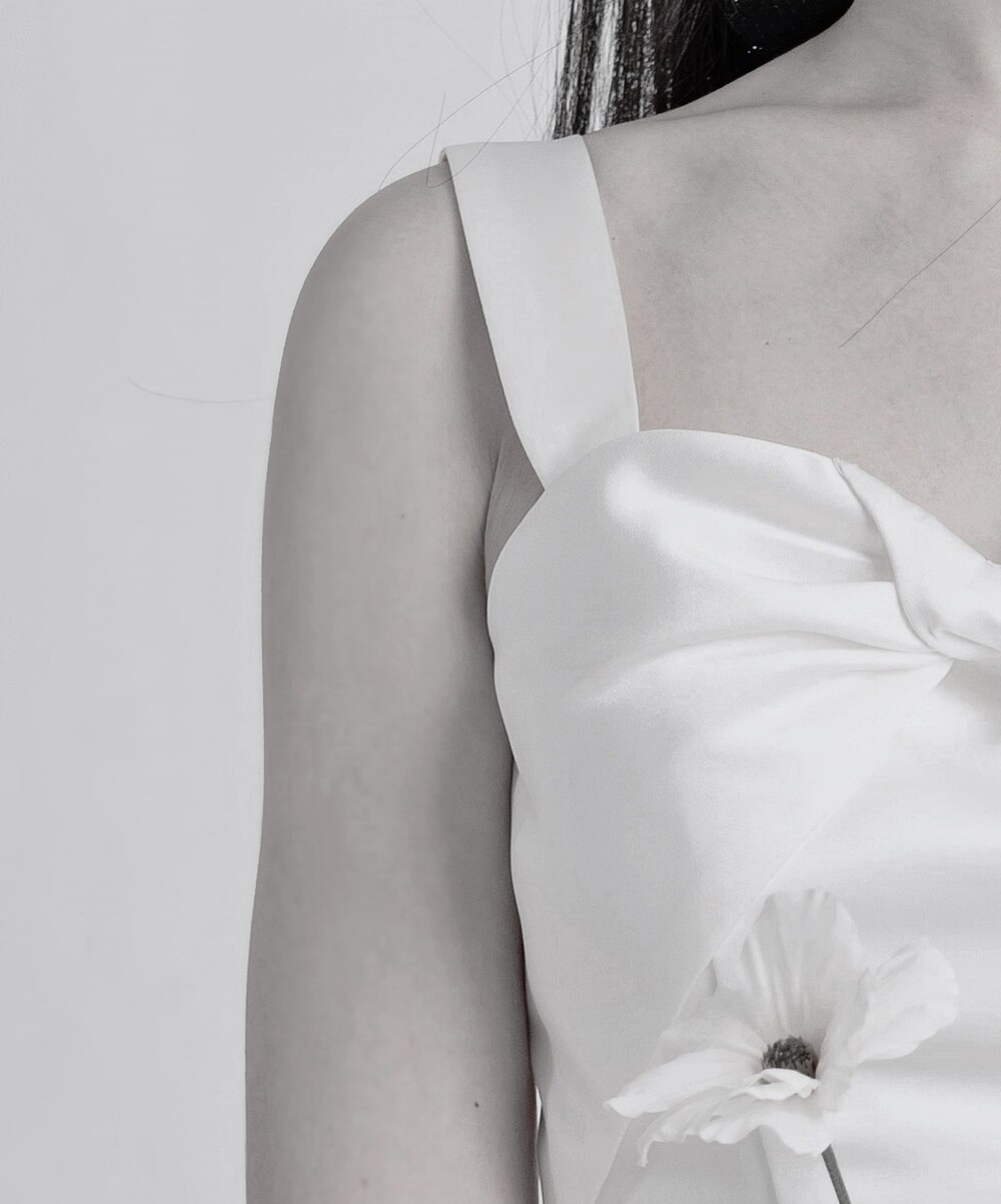 과하지 않게 퍼지는 A라인과 가슴부분의 리본 드레이핑으로 사랑스러움을 더했답니다.